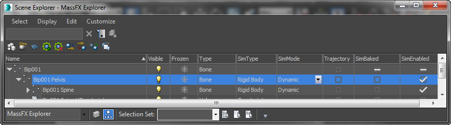 The MassFX Explorer is a specialized version of Scene Explorer dedicated to working with MassFX simulations. It allows you to view simulation properties for all objects in the simulation and change such properties as rigid body type and whether bodies take part in the simulation.