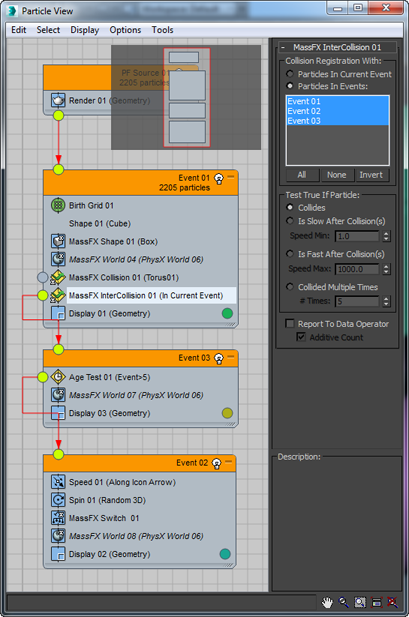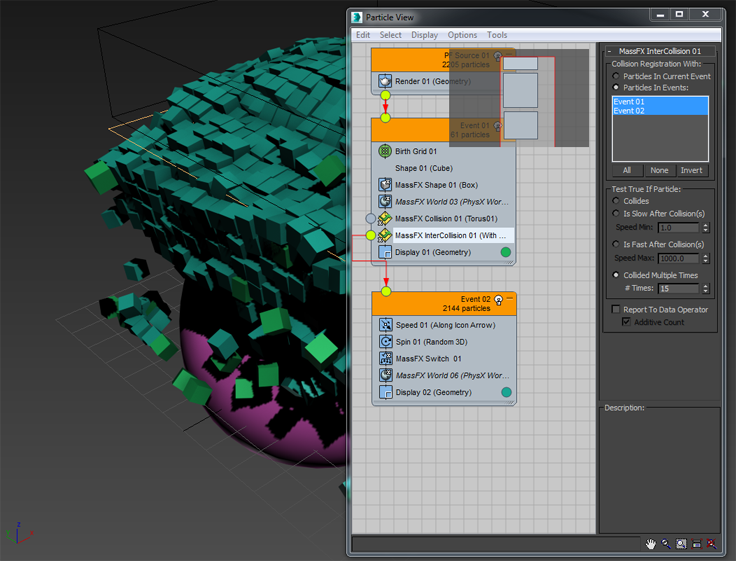 To illustrate the difference between the Collides and Collided Multiple Times options in the Test True If Particle group, look at another example: MassFXInterCollision02.max. This example contains two events, and particles are redirected to the second event if they collide with each other 15 times, according to # Times option. In the next event, particles are set to be static: Speed and Spin are equal to 0. The Speed and Spin values are set by regular Particle Flow operators (Speed 01 and Spin 01), but to make the particles static, a mParticles Switch operator is used.