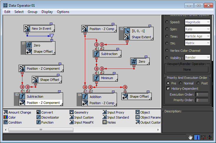Also, the Execution And Priority Order group also has Pre/Normal/Post radio buttons. This option defines the processing order on a higher level. If it set to Pre then this output is done before any operators in the current event are executed. If it is set to Normal, then the output suboperator is executed in the regular order, in-between the other operators in the same event. If it is set to Post then the output is processed after all operators and all tests in this particle system have finished their jobs for this integration step.