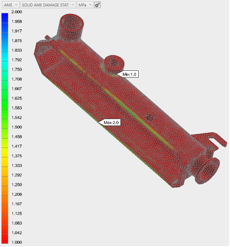 SOLID AME DAMAGE STATE result to examine the rupture state of the composite part. A value of 1.0 indicates the composite has not failed. A value of 2.0 indicates the composite has failed and the stiffness has been reduced.