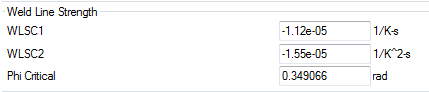 Before you can use Advanced Material Exchange to automatically predict the strength reduction factor of the weld surface points, you must specify three data points associated with your material. Specifically, you must provide cT1, cT2, and θc which are used in the Robbins method calculations. To add this data to your Moldflow material:
