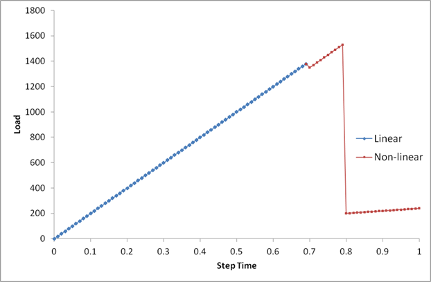 The solution of a progressive failure model can be divided into a linear portion and a non-linear portion. In terms of material nonlinearity, the distinction between the two portions lies in material failure. The linear portion is characterized by the absence of material failure while the nonlinear portion is characterized by the presence of material failure. Ideally, a single increment would be used in the linear portion and many increments would be used in the nonlinear portion to accurately resolve the propagation of damage. With this in mind, it is often the case that a significant portion of the solution is linear. Depending on the incrementation scheme, this can mean that much of the solution time is devoted to solving the linear portion of the solution. For example, consider the load-time plot shown below which color codes the linear and nonlinear portions of the solution for a model with a fixed increment size. Clearly, a majority of the increments are in the linear portion and this time is essentially wasted because the problem is linear until material failure initiates.