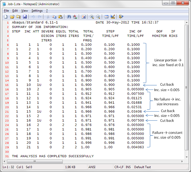 Since the initial and maximum increment sizes are 0.1, the increment size remains fixed at 0.1 until failure is predicted by Helius PFA. When failure is predicted, the solution will cut back to the previously converged increment, then progress using a starting increment size of 0.005. Once failure occurs the increment size will remain at 0.005 for the remainder of the analysis. So instead of using a fixed increment size of 0.005 for the entire solution, a relatively large increment size is used for the linear portion and 0.005 is used for the nonlinear portion. By reducing the number of increments devoted to the linear portion, the overall run time is reduced considerably. The scenario above is demonstrated with the example .sta file shown below.
