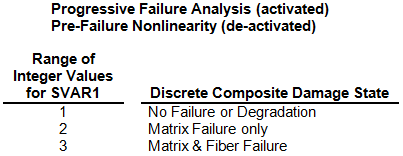 The fundamental MCT state variable is SVAR1 which indicates the discrete damage state of the composite material. SVAR1 is an integer variable. The range of integer values assumed by SVAR1 depends entirely upon the specific set of material nonlinearity features used during the finite element solution (see Appendix C). As a specific example, Appendix C states that if Helius PFA is used with its progressive failure feature activated and its pre-failure and post-failure nonlinearity features de-activated, SVAR1 can only assume the integer values 1, 2, or 3 as shown in the table below.