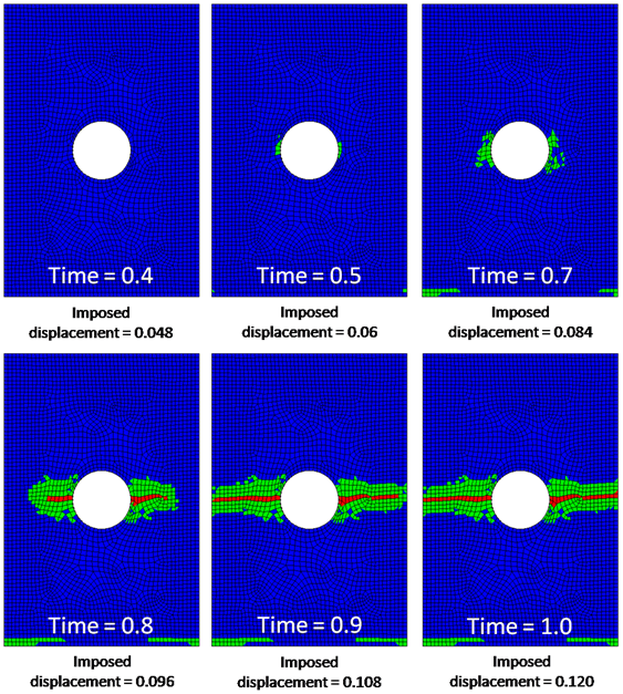 As an example of the above discussion, consider the image below which shows PLESOL contour plots of SVAR1=1,2,3 at several points in time during a progressive failure analysis. The composite plate has eight material plies and is loaded in tension. For simplicity, only the third ply of the laminate is shown. In these plots, the color blue represents integration points that have no failure, the color green represents integration points that have matrix failure, and the color red is used to represent integration points that have fiber failure.
