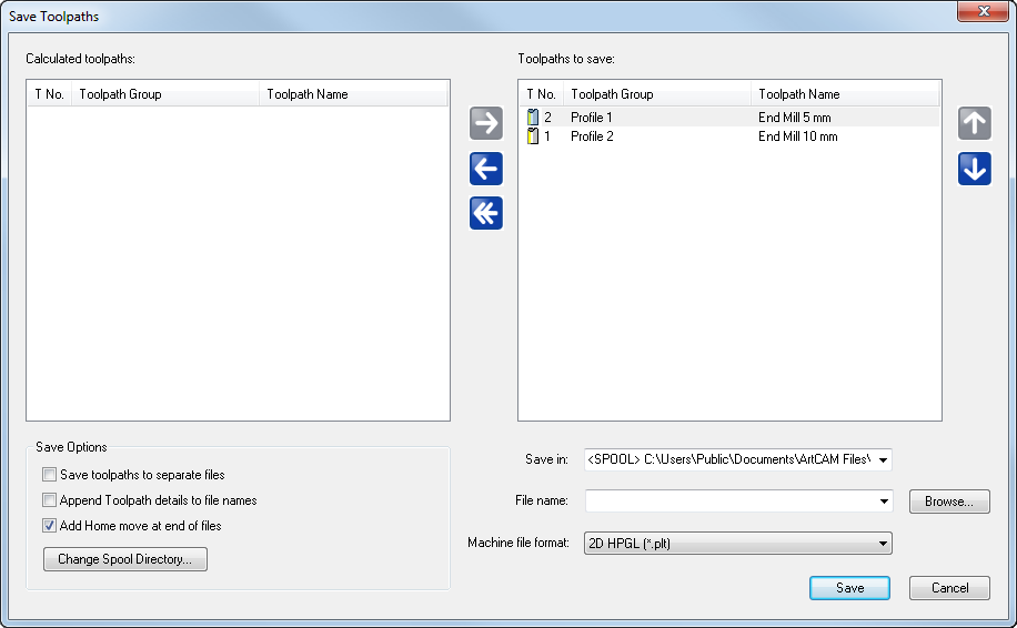 Save Toolpaths dialog is displayed, for example: