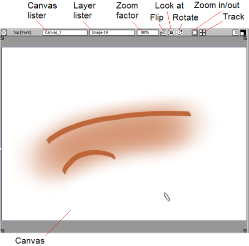 A paint window shows a full screen and head-on view of the currently active canvas. This allows you to more easily focus on the task of sketching, without being distracted by the 3D modeling world.