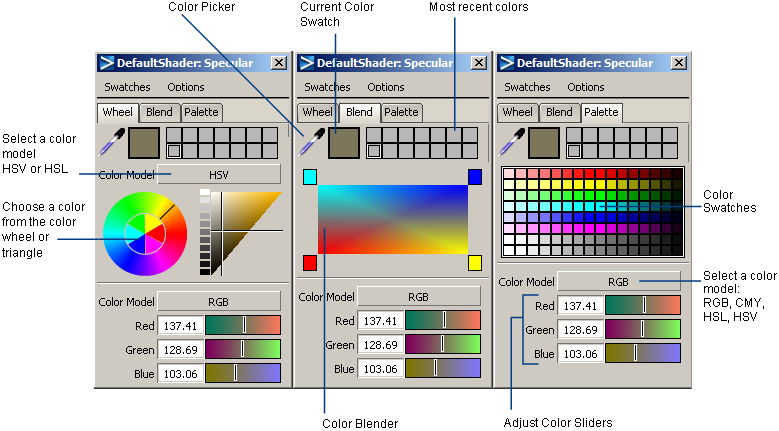 - Select a color model (HSL, HSV, CMY, or RGB) and adjust the sliders, or enter numerical values.