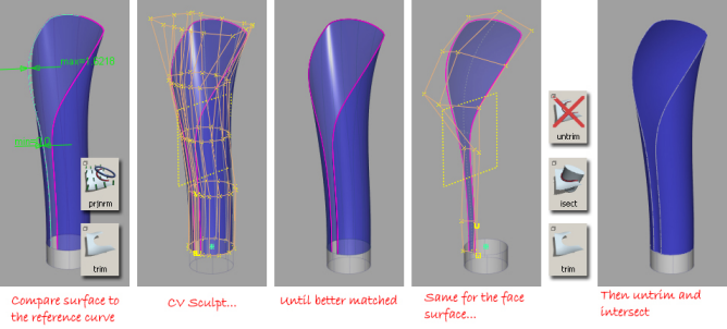 In the case of my handle, I learnt that the intersecting the two shapes gave me the design I wanted, but that it was tricky to get exactly the right intersection line just by pushing and pulling CVs. So I decided that I needed a 3D reference curve to help me get an accurate surface.