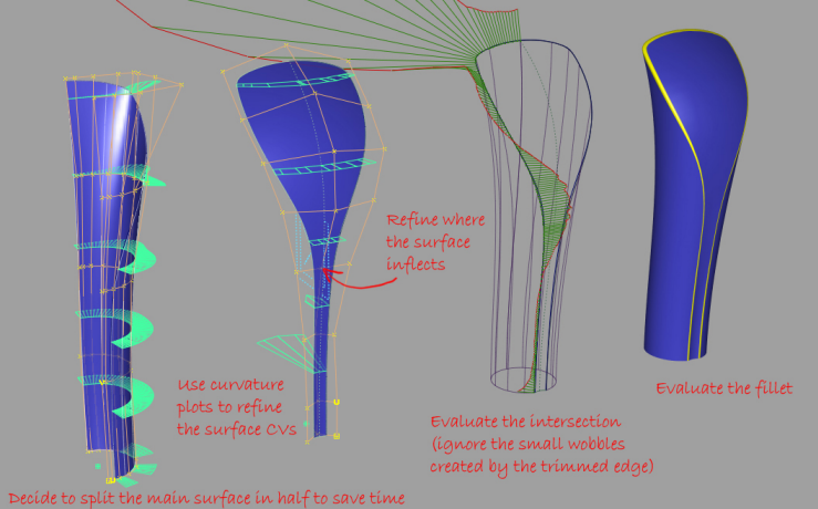 When you are designing by sketching on paper, how many sheets end up in the trash before you get the design you're happy with? Feeling free to throw your Alias surfaces away and keep learning about the 3D problem you are solving is the same process. Even the most experienced Alias modeller often doesn't know what patch layout to use, we just get quick at experimenting.