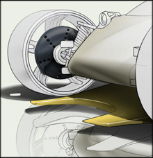 A slight hard edge of the tan is added to attain a slight shine without having an overly glossy feel to the nose of the car. A quick sketch is drawn over the model's heavy shadow. A layer is added below, and Airbrushed with a hard black. The lines of the sketch are used to erase the paint back to the confines of the shadow. The sketch layer is turned off and the shadow is tweaked with a Soft eraser and layer opacity. In this case, I duplicated the shadow layer and worked both layers to get the desired effect (most notably at the front "horns" of the underbody.) A quick stroke is added to a new layer below the sketch to start building up the reflection.