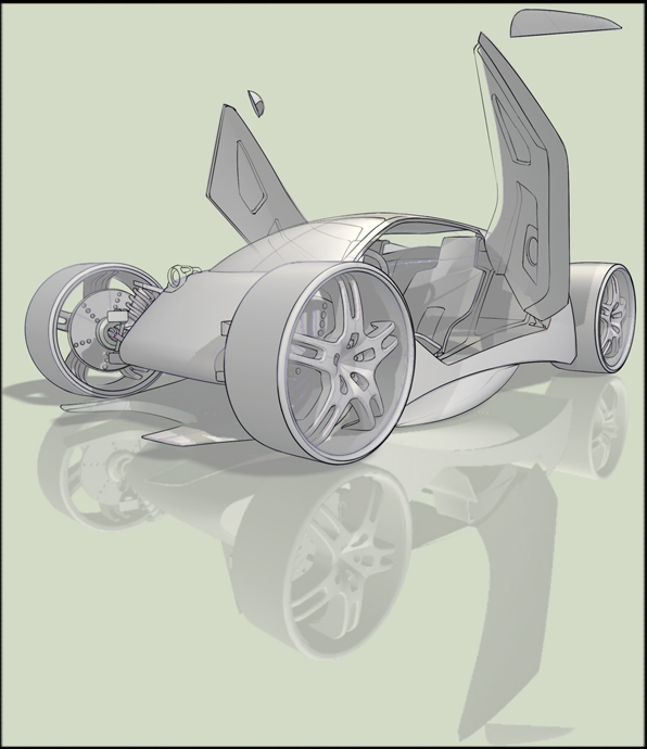 I add a new layer over the capture and flood fill with White. After pulling down the opacity so that I can see the sketch beneath, I add a new layer to begin the sketch. This is where I could start using the lines of the model to snap my pencil to, had I been using an overlay canvas.) However, I use freehand lines and predictive strokes to get the initial line drawing out. I've built up the door panels and interior as I didn't get around to modeling it before the sketch. I also added a small insect-like headlamp to the front end. This is a process of creating layer after layer to avoid erasing or drawing over completed line work. Once the sketch is completed, I merged all the layers, except for the bottom two.