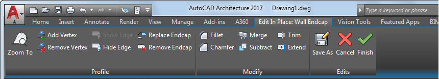 Edit in place is a special editing mode where polyline- or profile based object components can be edited directly on screen, while other editing capabilities in the drawing are limited. For example when you are in edit-in place mode, you can change a wall endcap, but you cannot save and close the drawing. Upon exiting the edit-in-place mode you can choose if the changes should be discarded, overwrite the existing component definition, or be saved as a new definition.