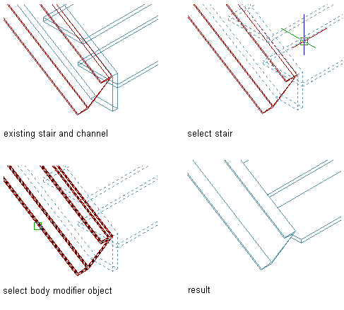 The following illustration shows you how to use a channel as a body modifier to replace a stair stringer component.