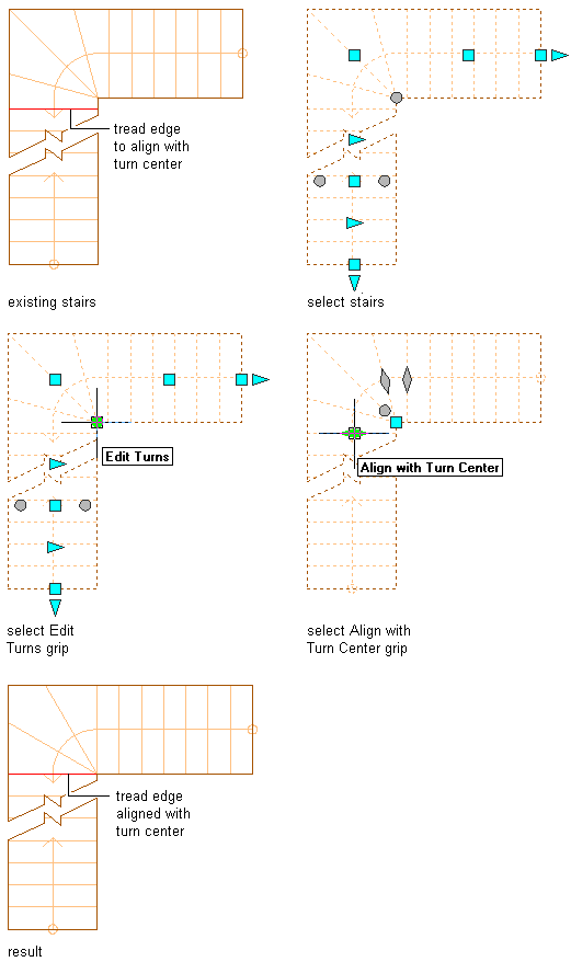 - When you have finished editing the tread edge alignment, you can click the Exit Edit Turns grip to return to the default stair edit mode, or right-click and click Deselect All to turn off grips.