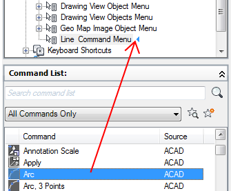 - In the Command List pane, drag the command that you want to add to the shortcut menu in the Customizations In <file name> pane.