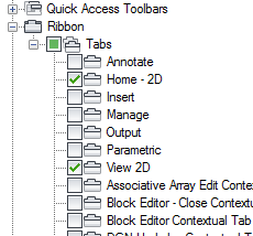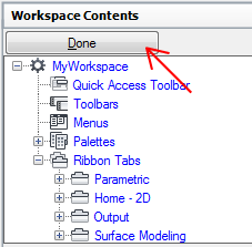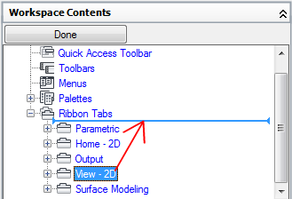 - In the Workspace Contents pane, click the plus sign (+) next to the Ribbon Tabs node to expand it.