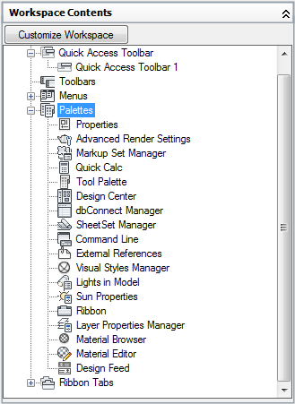 Use the CUI Editor to control the display of the Quick Access toolbar, ribbon tabs and panels, tool palettes, toolbars, and pull-down menus.