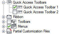 - In the Customizations In <file name> pane, click the plus sign (+) next to the Quick Access Toolbars node to expand it.