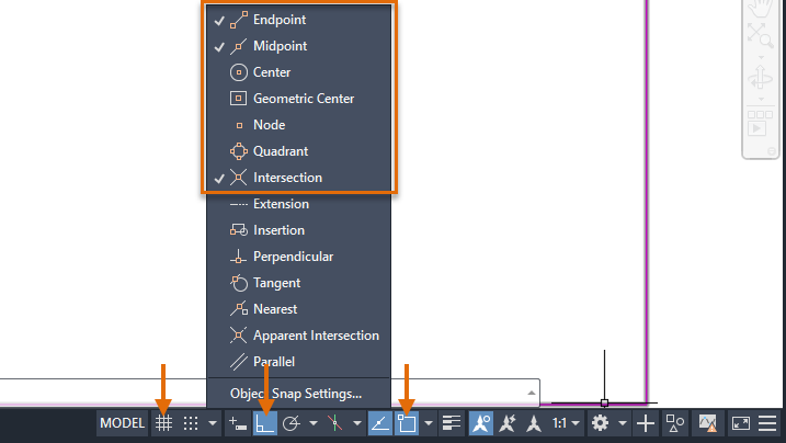 You should notice the extents of the drawing now shows a rectangle that is 828 x 552 units in size on the title_block layer. Additionally, if you look at the status bar, you should notice the three running object snaps are enabled along with ortho mode being enabled and grid mode being disabled.