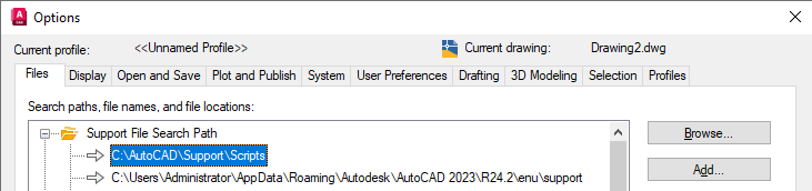 Note: You can manage the folders of the AutoCAD Support File Search Path setting on the Files tab of the Options dialog box (OPTIONS command). For information on adding folders to the AutoCAD Support File Search Path setting, see To Modify Support File Search Paths.