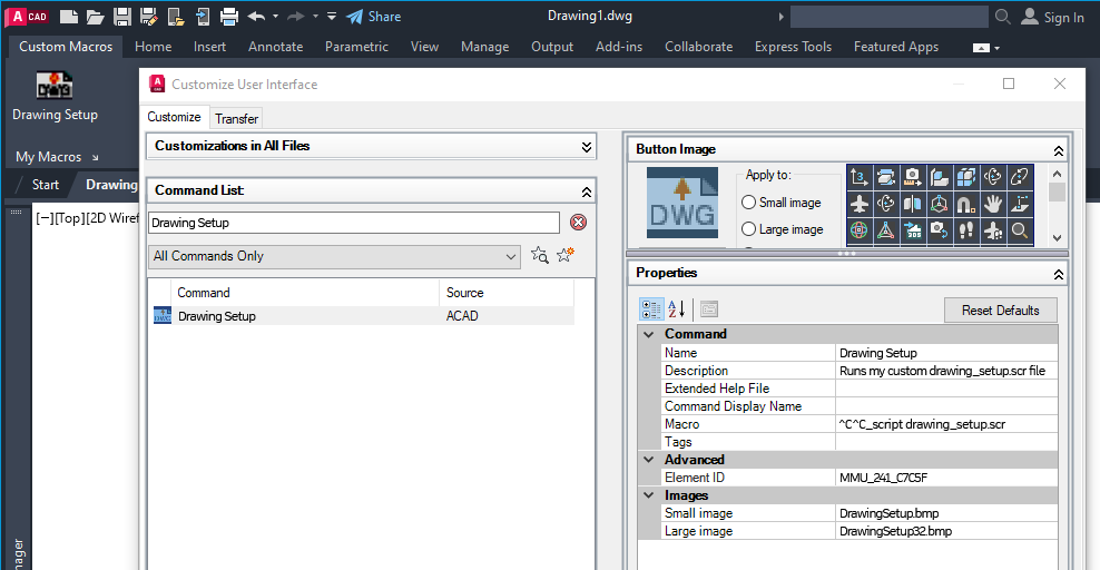 It is possible to define a macro with the SCRIPT command to run a specific script from a ribbon button. The following is what a macro might look like that starts the SCRIPT command and runs a script file named drawing_setup.scr: