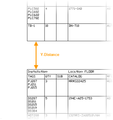 The X-distance and Y-distance values define the distance from the end of one table section to the beginning of the next. It is used when multiple table sections for one report are on the same drawing. A blank value is interpreted as zero.