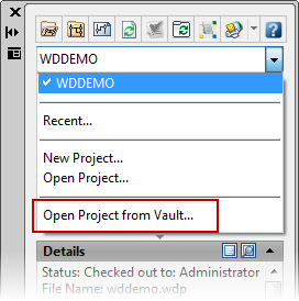 In the Project Manager, select Open Project from Vault from the project selection menu.