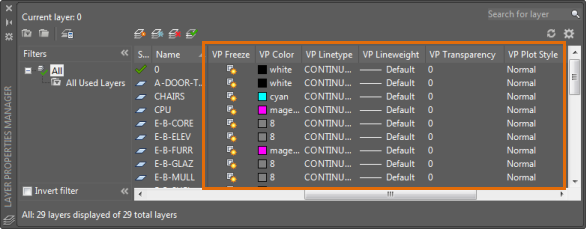 Layer property overrides are applied to the current layout viewport. When you double-click a layout viewport to make it current, extra columns are shown on the Layer Properties Manager.