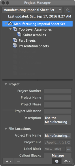 Details Panel. Displays the properties for the item selected in the Project tree view. Click the Show/Hide Details button at the bottom of the Project Manager to toggle the display of the Details panel.