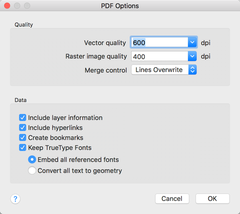 Tip: When you generate PDF files from drawings that contain a lot of detail, such as a topographical map of a large region, use a higher resolution setting for greater detail. As you increase the resolution setting, the image quality increases, the speed of printing decreases, and the file size increases.