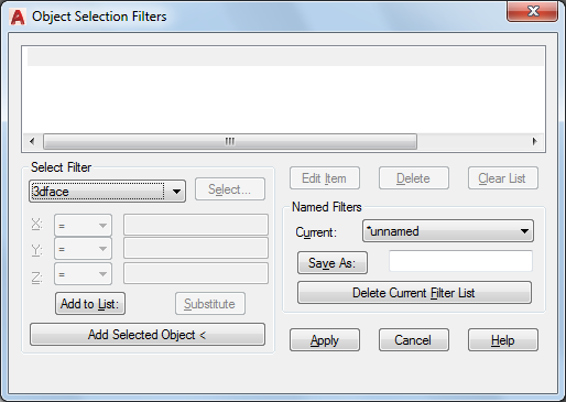 Displays a dialog box listing all items of the specified type in the drawing. Select the items to filter. For example, if you select the object type Color, Select displays a list of colors to choose for the filter.