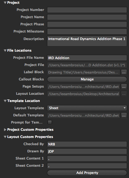 Displays the paths for the project, page setup overrides, and the callout and label blocks used by the project.