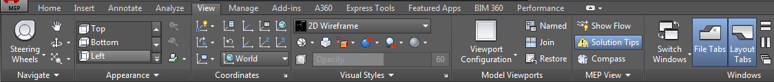 - MEP View. Provides tools to see the flow direction of ducts and pipes, a command to display broken connections (solution tips), and a way to adjust the compass settings. The expanded tab provides a way to hide the compass bar, and a tool for controlling the size of solution tips.