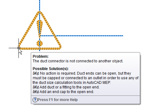 The intended interaction among objects in an AutoCAD MEP drawing depends on various rules about how objects are placed in relation to one another. Whenever the software identifies a problem with the placement of objects or their components, a solution tip icon is displayed to identify the location of the problem, as shown.