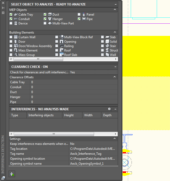 Note: The Interference Analysis mode works on a per drawing basis. If you switch to another drawing, the Interference Detection palette will be updated, based on the currently active drawing.