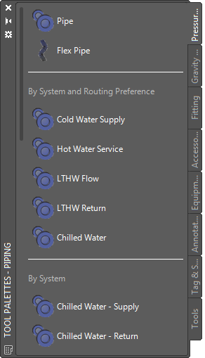 An object tool inserts an object, such as a duct or a pipe, into a drawing. When you add an object with a specific object tool, the object has the settings that are defined in the tool, which facilitates the design process and enhances consistency across your project drawings.