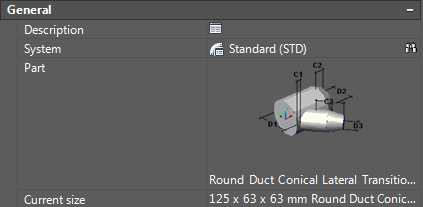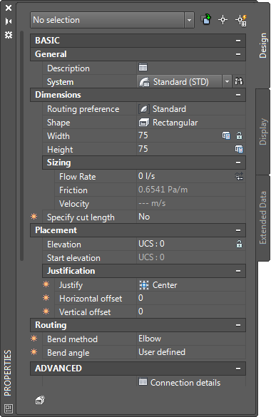 Routing preference | Selects a routing preference for the duct object in the current drawing. | Standard (default); selections derived from the catalog |