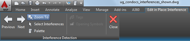hide the Interference Detection palette to view more of the drawing Note: Use the Next Interference and Previous Interference buttons on the Interference Detection panel to move from one interference to the next.