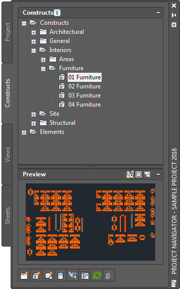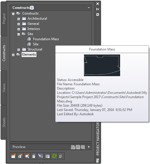 In the Project Navigator, you can display thumbnail previews of project drawings. The preview can be a graphic or a detail, or a combination of both. Displaying thumbnails can be helpful when you are navigating large projects with many drawings.