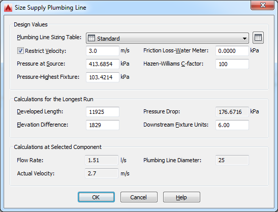 Two sections of the Size Supply Plumbing Line dialog box provide you with final calculations: