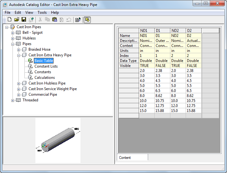 Pipe parts catalogs are organized differently, depending on the profile in which you run AutoCAD MEP. Catalogs in the US Imperial and US Metric profiles are organized based on material type: