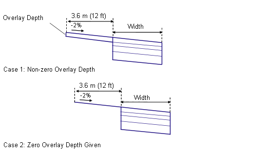 If the Overlay Depth is zero, the widening lane extends outward from the Insert Point Offset on the Existing Surface at the superelevation slope for the given Width.