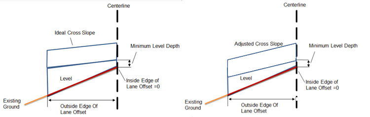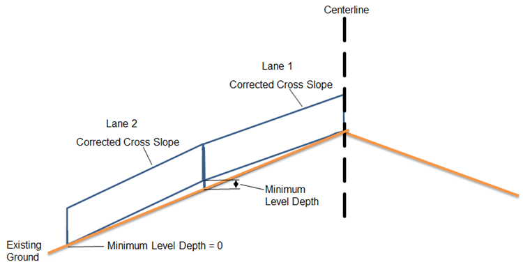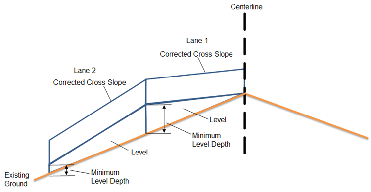 This use case occurs when the level depth at the start of a second lane is less than the than minimum level depth. In this case, the attachment point will lock to the previous subassembly. No vertical adjustment is needed for this use case, but flapping will be applied. Flapping will attempt adjust cross slope for the overlay layer to produce Corrected Cross Slope that matches a minimum level depth of 0.