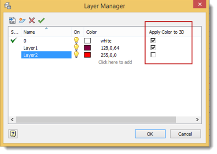 To help you easily distinguish assets by layer, select the new Apply Color to 3D option in the Inventor Layer Manager to apply the layer color to assets within the layer. Leaving this option unchecked retains the original asset colors regardless of layer color.