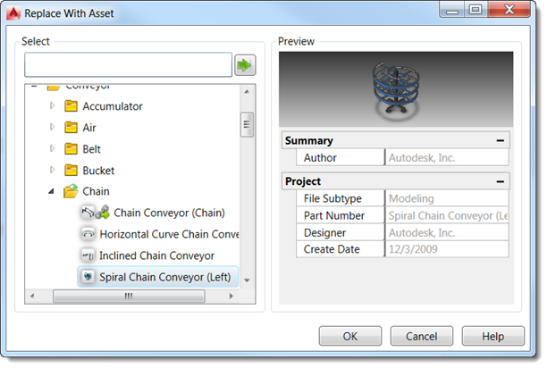 A selection window of asset library folders appears. Select from a folder or search for an asset via the Search field at the top of the window. A preview of your selected asset appears on the right.