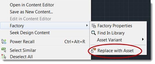 To replace an asset, select it in the layout, right-click to view the context menu, and select Replace with Asset from the Factory sub-menu. You can select multiple objects if you are replacing them with the same asset.