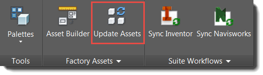 Clicking Update Assets on either the AutoCAD or Inventor Factory ribbon displays a list of assets in the current layout with updates available. Select an asset to bring it up to date with the latest definitions; unselected assets remain unchanged.