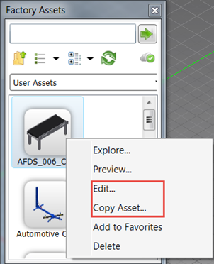 Right-click on an asset in the Asset Browser to view an expanded menu that includes a Copy option for system assets, and Copy and Edit options for user assets.