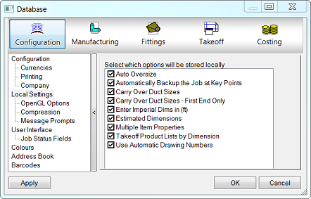 Similarly, when these options are selected in Local Settings, the following options display with a green background on the Configuration Database dialog.